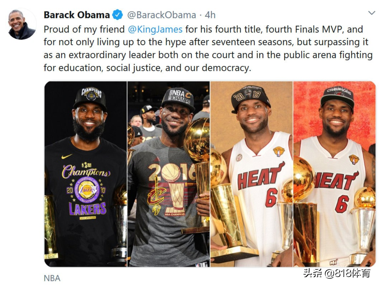 詹姆斯收获了17年职业生涯第4座总冠军奖杯,并以全票当选总决赛MVP。美国前总统奥巴马今天在他的个人推特上向詹姆斯送上了祝贺。