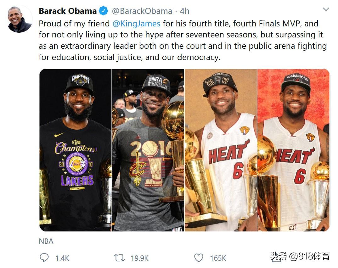 “为我的朋友@勒布朗-詹姆斯 感到骄傲,他刚刚赢得了第4座总冠军奖杯、第4个总决赛FMVP,我为他在生涯第17个赛季依然没有辜负大家的期待而骄傲。在球场内外,他都是一位成就卓越的领袖。他一直在为教育、社会公平和我们的价值而奋斗。”奥巴马写道。