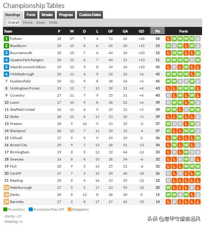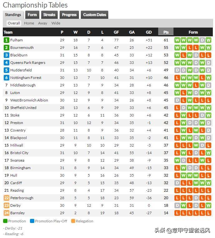 1.富勒姆61分,2.伯恩茅斯55分,3.布莱克本53分,4.女王公园巡游者52分,5.哈镇49分,6.诺丁汉森林46分,7.米德尔斯堡46分,8.卢顿45分,9.西布朗45分,10.谢联45分,11.斯托克城42分,12.普雷斯顿42分,13.考文垂41分,14.布莱克浦41分,15.米尔沃尔37分,16.布里斯托尔城37分,17.斯旺西城35分,18.伯明翰33分,19.赫尔城32分,20.卡迪夫城32分,21.雷丁22分,22.彼得伯勒联20分,23.德比郡18分,24.巴恩斯利14分