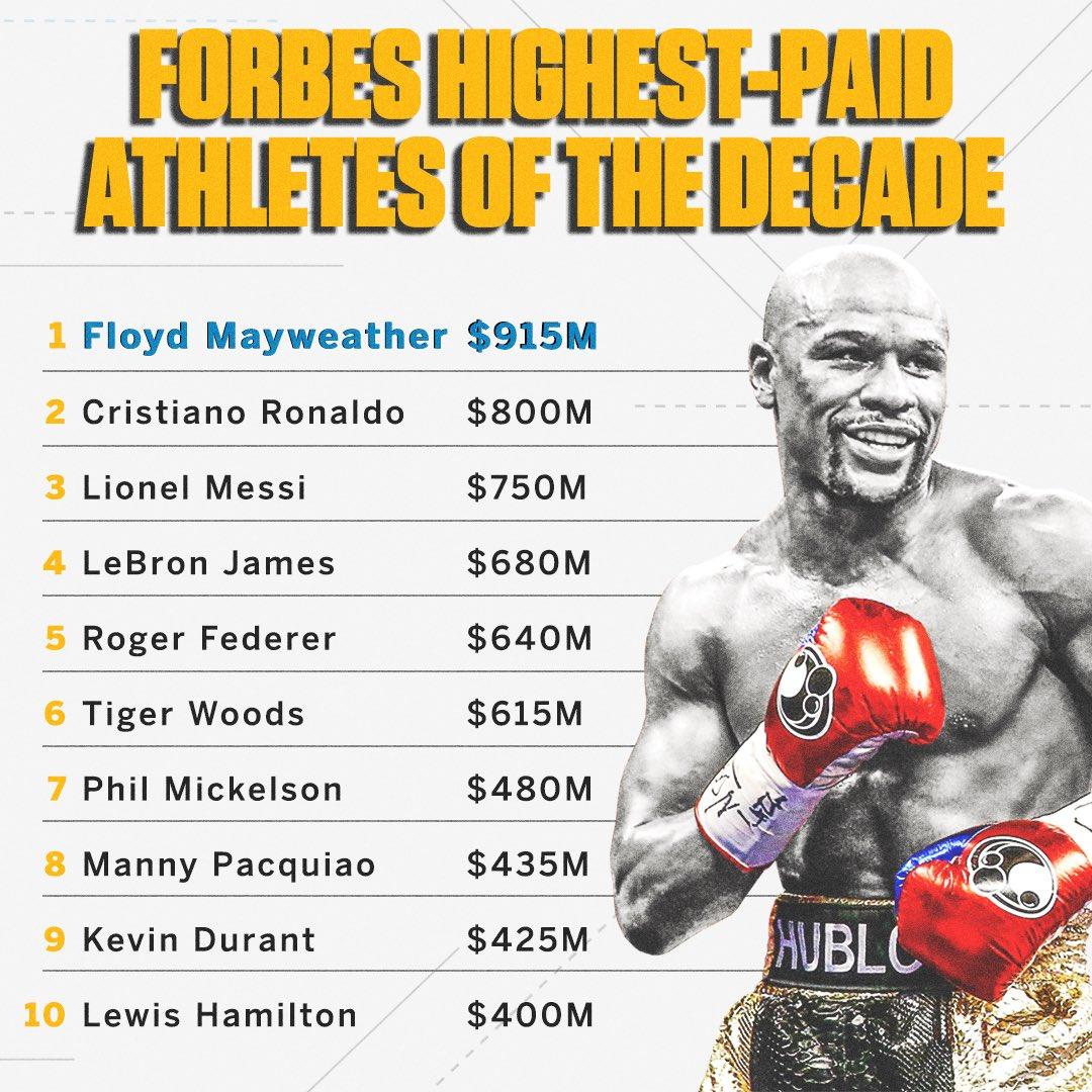 近日,福布斯发布了近10年的"最高收入运动员排行榜",前五个级别世界拳王、50战不败的P4P之王"金钱"弗洛伊德·梅威瑟,以9.15亿美元(64亿人民币)的巨额收入毫无争议的问鼎了榜首。