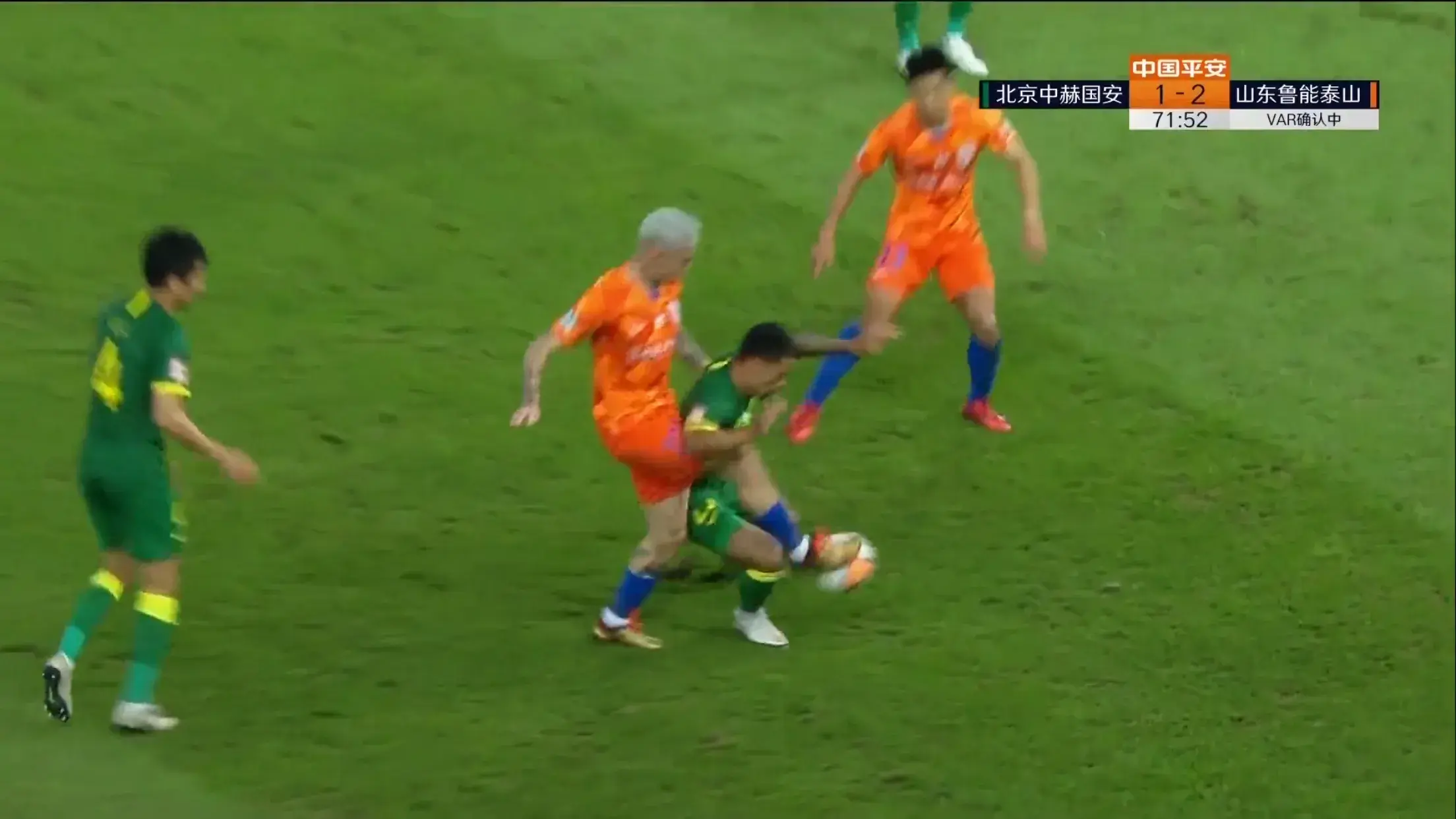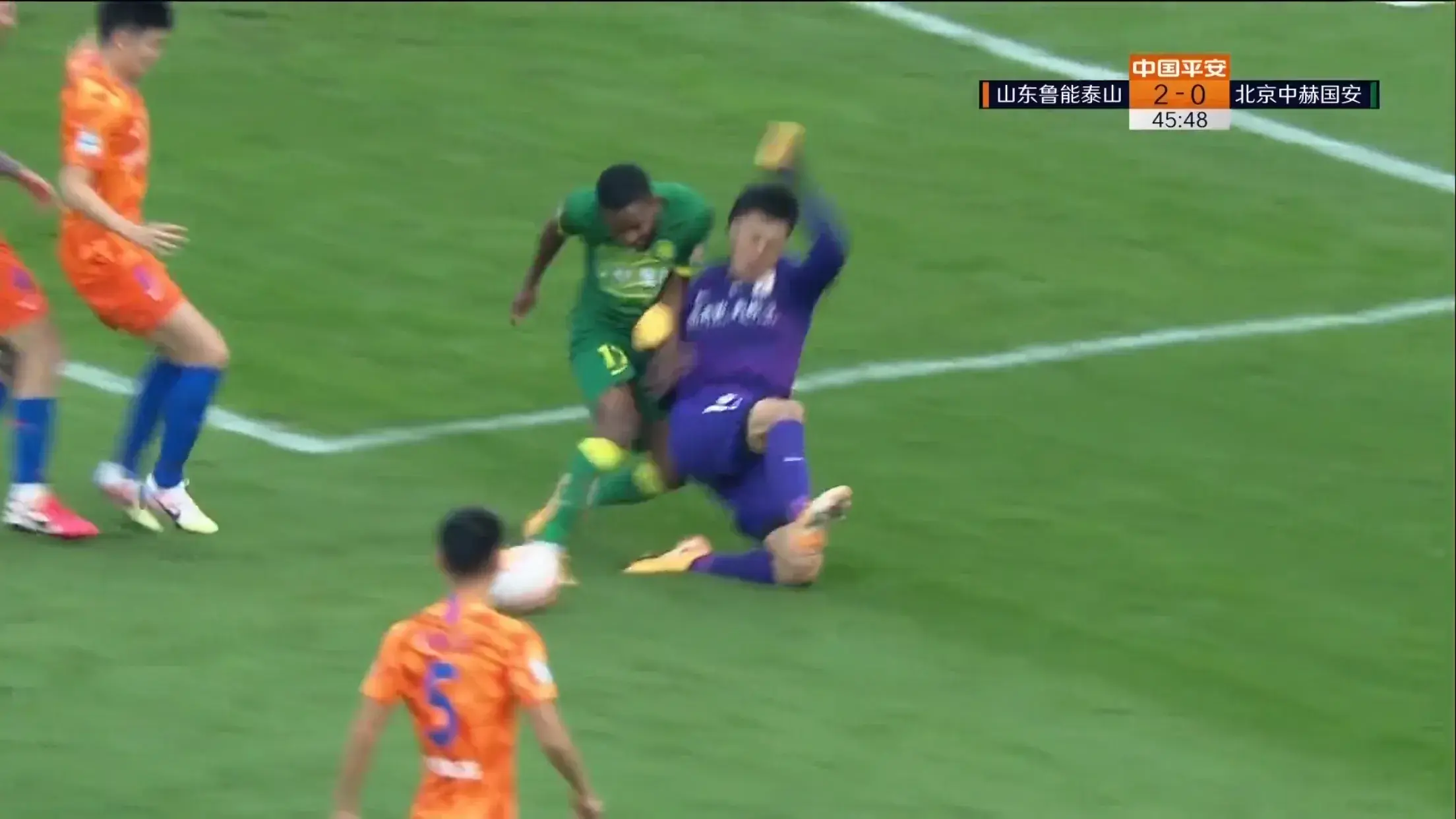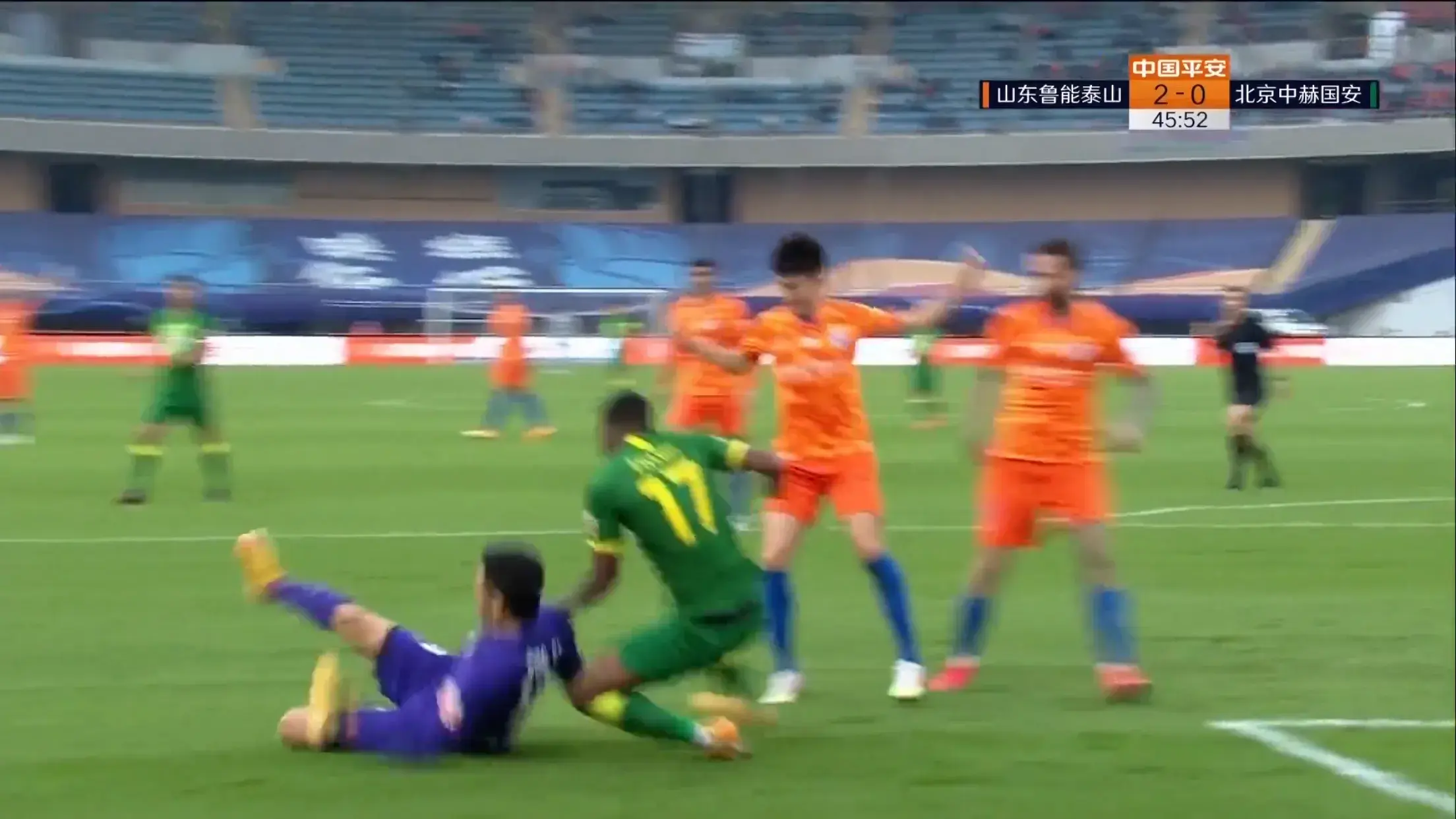 第45分钟,张稀哲后场长传找到巴坎布,巴坎布左路拿球内切杀入禁区,面对3名鲁能后卫,巴坎布先是穿裆过人,最后被补位的郑铮滑铲放倒,主裁考绍伊犹豫了一下后吹罚点球,在经过视频复审后,考绍伊坚持了点球的判罚,奥古斯托一蹴而就,将场上比分扳平,半场结束,北京国安主场2-2山东鲁能。