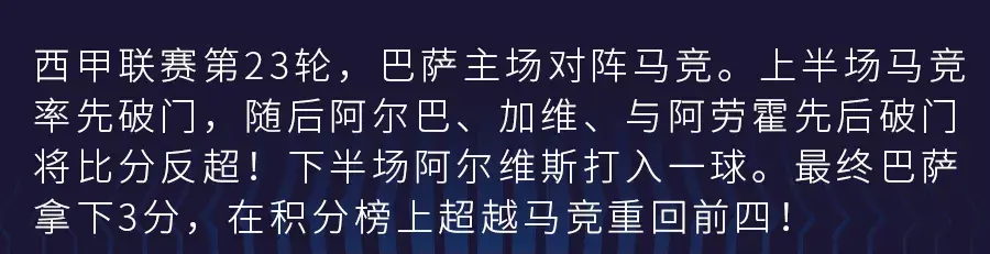下半场易边再战,比赛第48分钟,阿尔维斯进球,随后马竞扳回一城。巴萨4-2马竞。