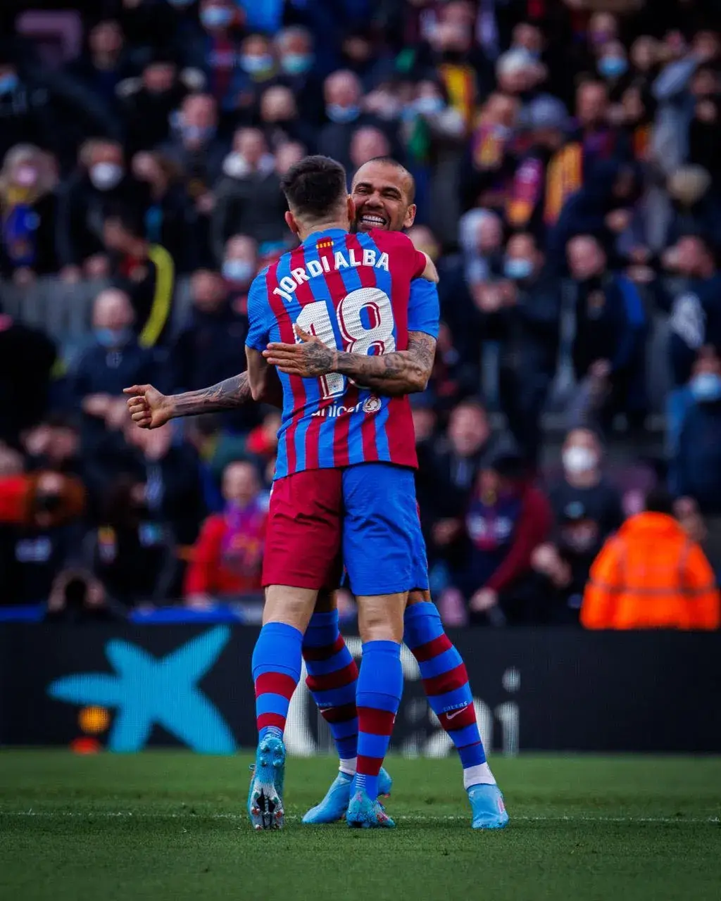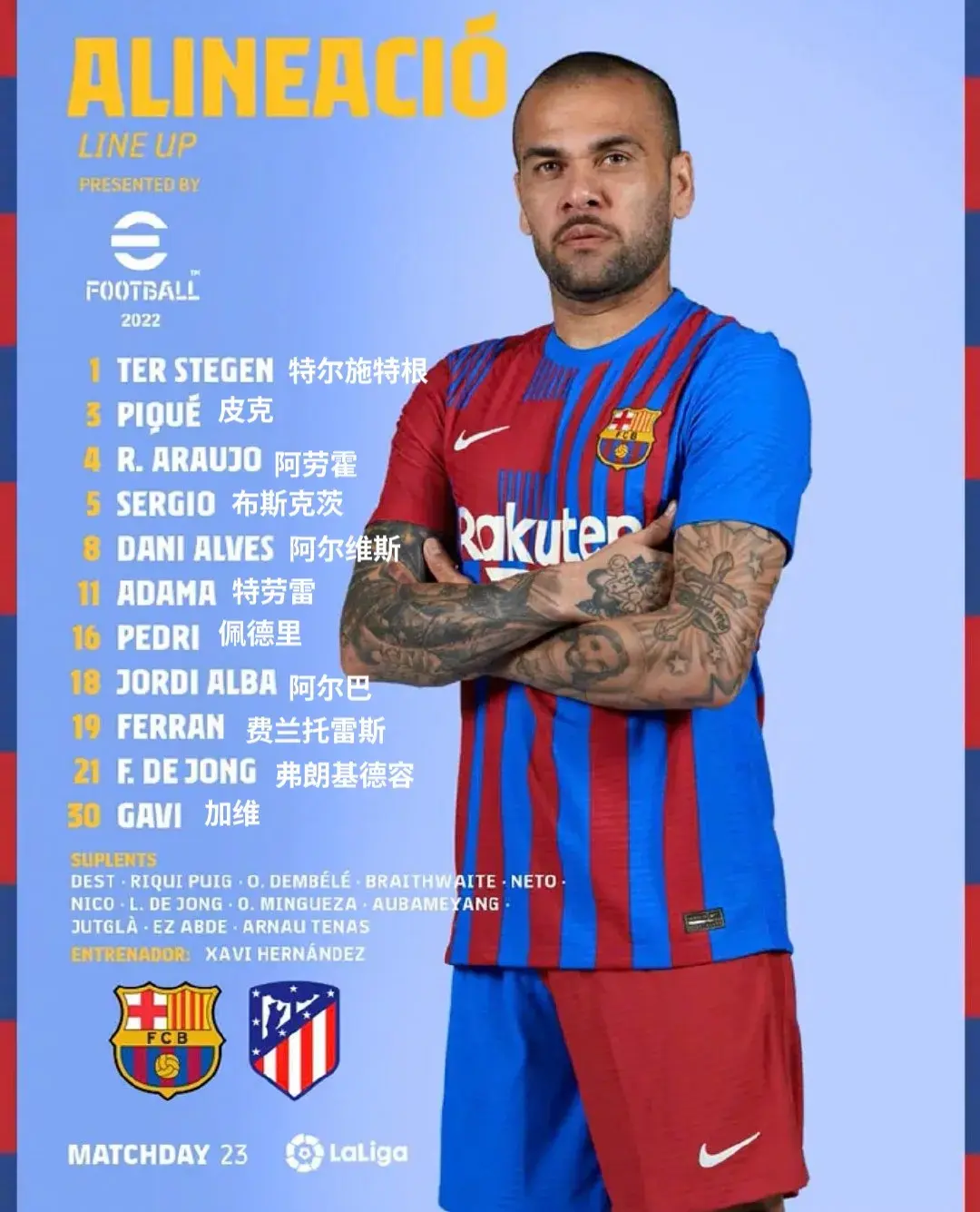 后卫:3-皮克,4-阿劳霍,8-阿尔维斯,18-阿尔巴