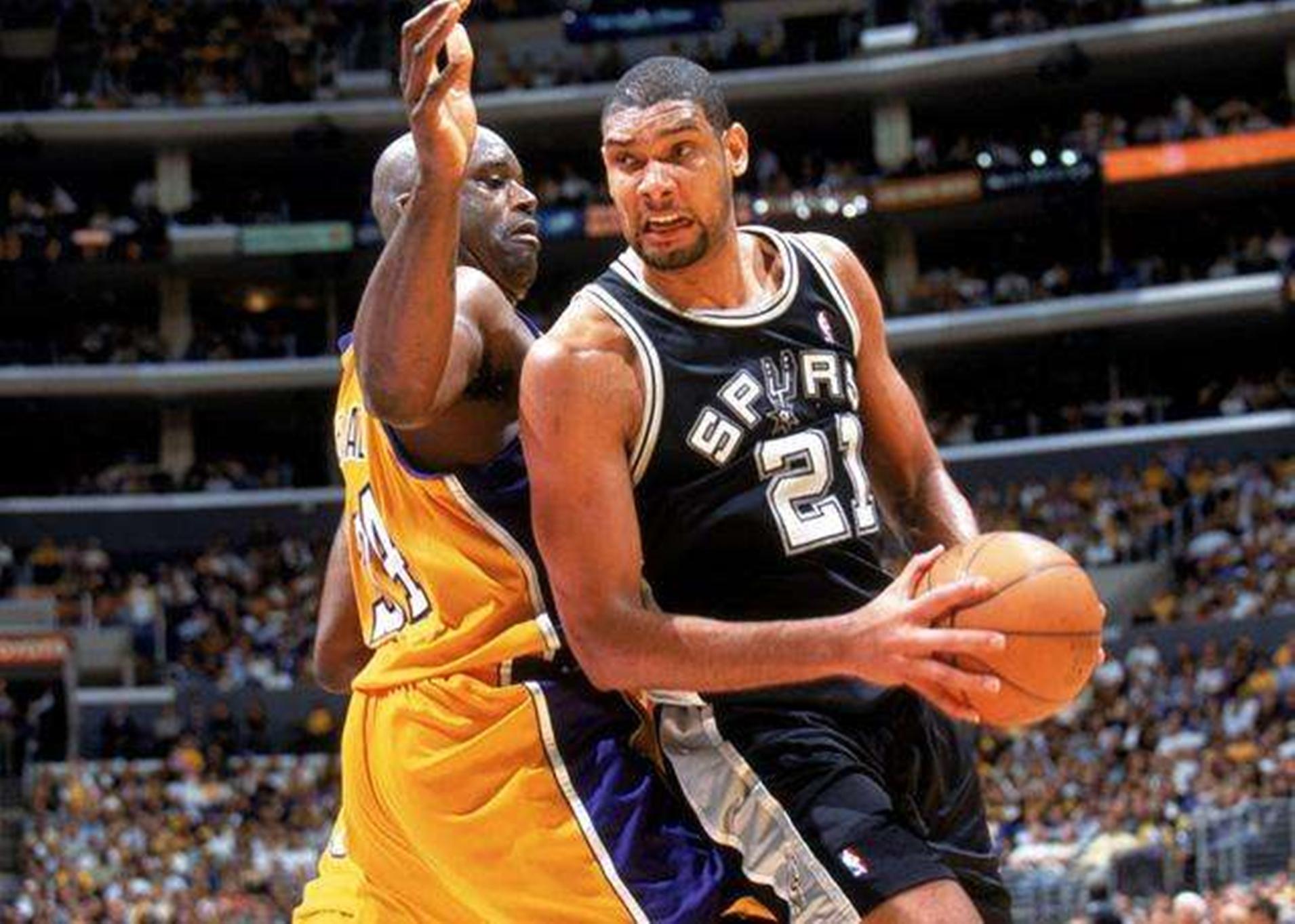 1999年马刺双塔夺冠,他们在西部半决赛干净利落的4-0击败了洛杉矶湖人队。当时的湖人队OK组合已经初露峥嵘,但是科比还稍显稚嫩。那时的邓肯如日中天,身体劲爆,既有技术又有弹跳,要知道他在进入NBA之前的绰号叫做“飞天魔鬼”。2米11的身高,2米31的臂展,站立摸高2米88,弹跳出众。在99年内线和奥尼尔对战的时候,占上风的反而是邓肯,他的攻击范围更广,弹跳更出众。