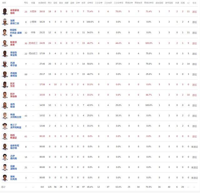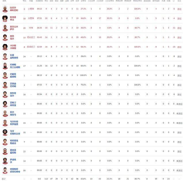 奇才(2-4):普尔24分3助3断4帽,卡林顿16分8板6助,萨尔10分11板,乔治20分6板4助,库利巴利9分4板,瓦兰丘纳斯16分12板7助,基斯珀特4分5板,巴特勒7分3助