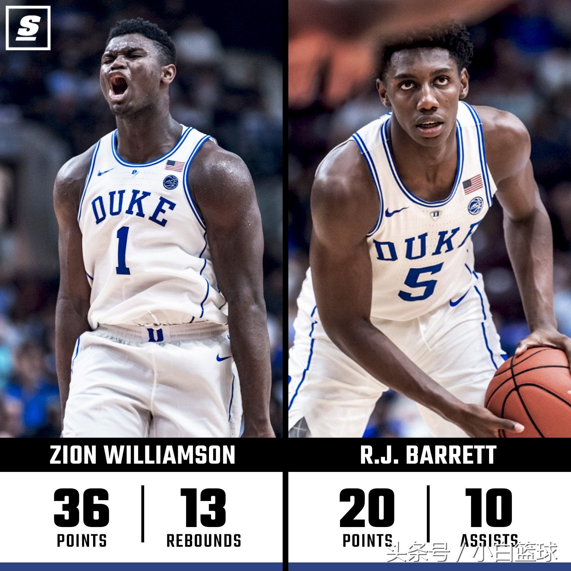 8月20日,杜克大学的两大状元热门RJ-巴雷特与蔡恩-威廉森一同带领杜克大学在季前赛中以103-58战胜了麦吉尔大学,这场比赛中蔡恩-威廉森出战31分钟,23投15中得到36分14篮板4助攻3抢断2盖帽;RJ-巴雷特出战29分钟,16投8中拿到了23分10个助攻6篮板2抢断,论数据蔡恩-威廉森明显力压RJ-巴雷特一筹,这场比赛中蔡恩-威廉森更是有一记惊人的平框暴扣!