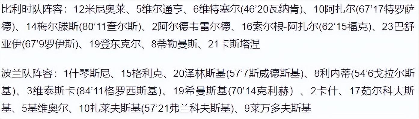 欧国联三轮之后,比利时队和波兰队同积4分并列小组第二。两队首回合交锋,比利时队6-1大胜波兰队。本场比赛,波兰的莱万和比利时的阿扎尔都首发出场。