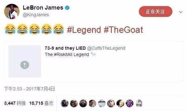 17年夏天,某位勇士黑粉在推特上讽刺了一年前勇士73胜9负却输掉总决赛。他写道:73-9,and they lied(他们的73胜9负在说谎)。本来这只是一条再普通不过的黑粉推特,哪晓得詹姆斯也转发了,还加了几个笑哭的表情,直接引起了两方球迷的口水战。而对于詹姆斯的转发,追梦格林毫不客气得回应道:我们差点就在今年横扫了他(2017年总决赛)。