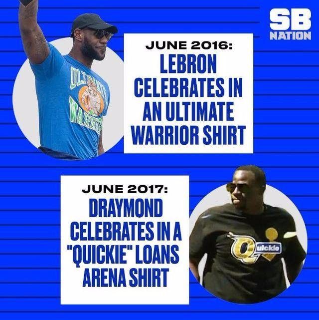 两人的斗争远远不只在比赛中这么简单。16年夺冠后,詹姆斯穿上了印有“Untimate Warrior”(终极勇士)的T恤,被球迷解读为讽刺被逆转的勇士。所以当勇士17年夺冠后,格林穿上了“Quickie”的T恤,对此,格林解释道:这个Q就是他们主场球馆的名字改编而来,我想叫他们赶快出来,我在这等他们!