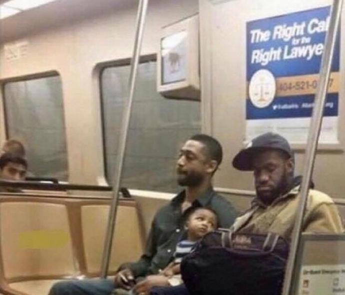 这张照片也是十分有趣,山寨版的詹姆斯和韦德同坐地铁带娃,浓浓的CP感扑面而来,只不过这个韦德有点瘦,但是翻版老詹却真的十分相似。