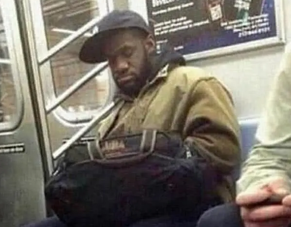 震惊!年入千万美金的詹姆斯竟然落魄乘坐地铁!当然,这个睡在地铁里的人并不是老詹本詹,只是和老詹长得太相像了!这张照片源自一位美国网友在地铁上的随手一拍,原图如下:
