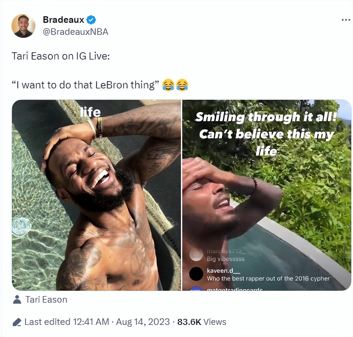 北京时间8月14日,火箭球员塔里-伊森在IG上直播时模仿了勒布朗-詹姆斯经典泳池仰头动作,伊森还说道:“我想做勒布朗的那个动作。”