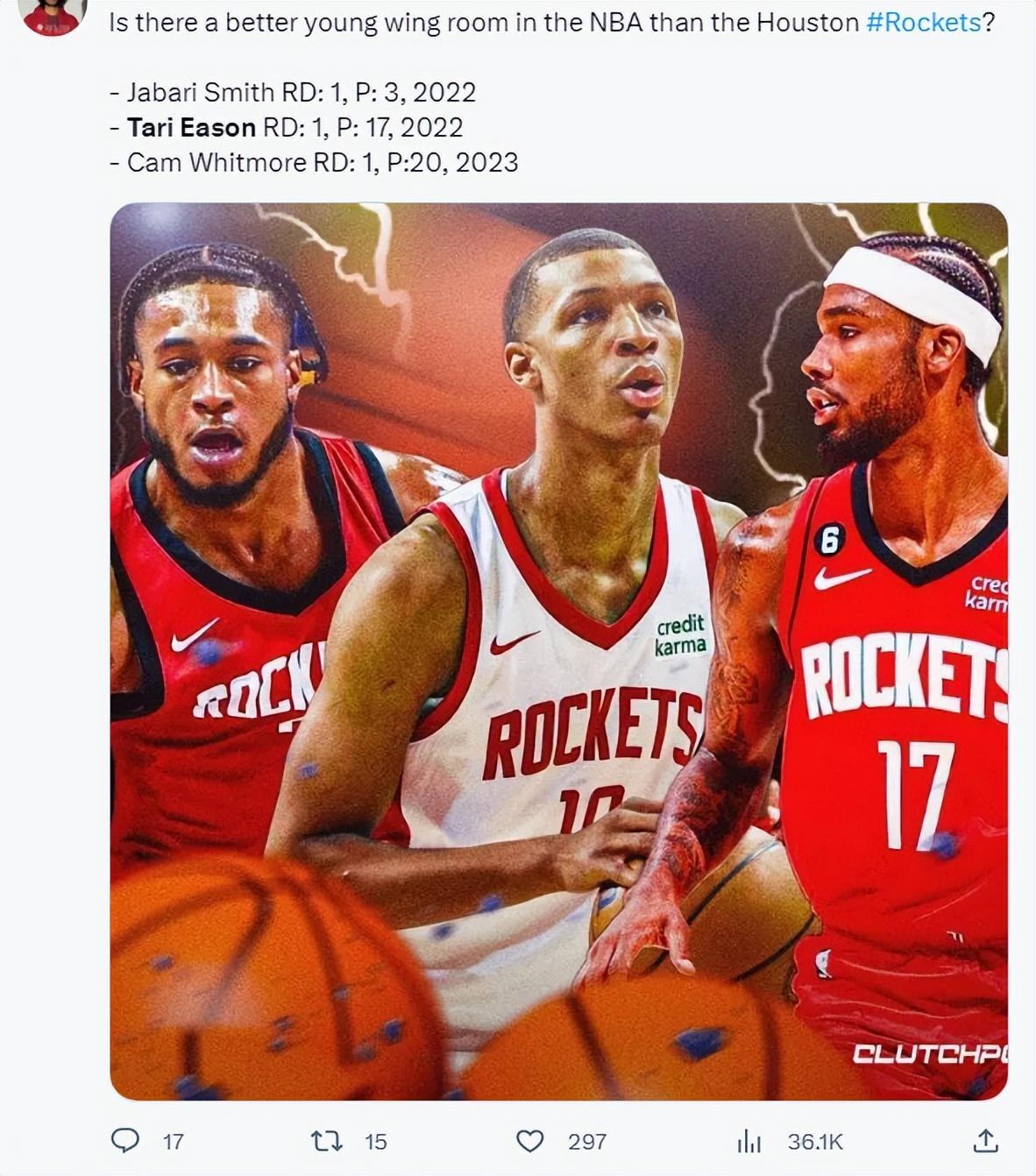 火箭媒体还询问史密斯、惠特莫尔、伊森谁会成为未来最好的锋线?火箭球迷很多都选择了伊森,他们认为伊森可以打三号位,史密斯应该打四号位,白魔可以打2-3号位轮换。