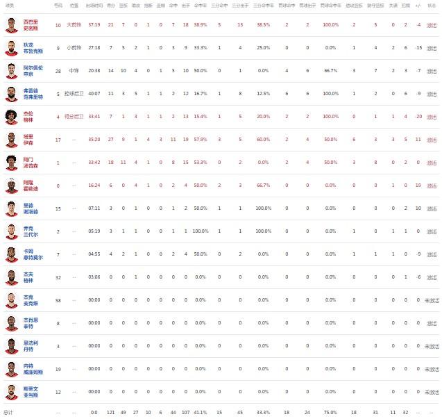 休斯顿火箭伊森27分9板1助4断3帽,小贾巴里-史密斯21分7板,阿门-汤普森18分11板4助1断,杰伦格林13中2拿到7分3助;