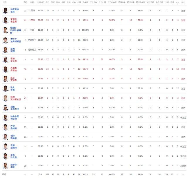 金州勇士希尔德27分7板2助1断1帽,库明加23分6板1助,维金斯15分3板2助1断。