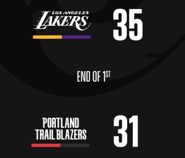 第一节开拓者艾顿拿下8分,湖人詹姆斯拿下9分,首节战罢开拓者23-30落后湖人