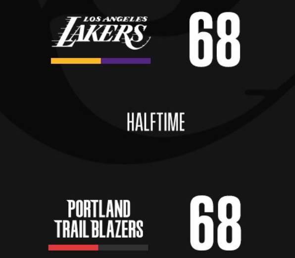 第二节开拓者格兰特拿下8分,湖人詹姆斯拿下10分,半场结束开拓者50-60落后湖人