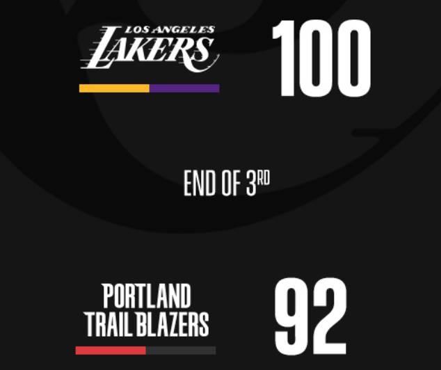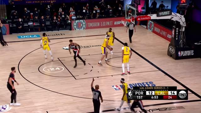 第三节开拓者格兰特拿下9分,湖人詹姆斯拿下9分,第三节结束开拓者75-82落后湖人