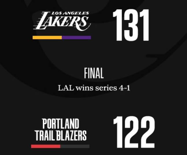 末节开局湖人手感回落突然不会打球开拓者则在努尔基奇的2+1带动下开始反扑,随着麦科勒姆的进球和西蒙斯的三分命中,开拓者开局一波8-0的攻势再度抹平比分。暂停归来詹姆斯迅速用三分稳住局势,而开拓者方面除了麦科勒姆和安东尼外,小特伦特发力连拿8分为球队追赶比分,奈何湖人这边浓眉哥也是稳稳输出,一记中投外加2+1连拿9分帮助球队重新拉开比分,开拓者自此便再也没能制造威胁,湖人进攻端稳定输出稳守领先。最终,湖人轻取开拓者拿下G5的胜利,并以4-1的总比分晋级半决赛。