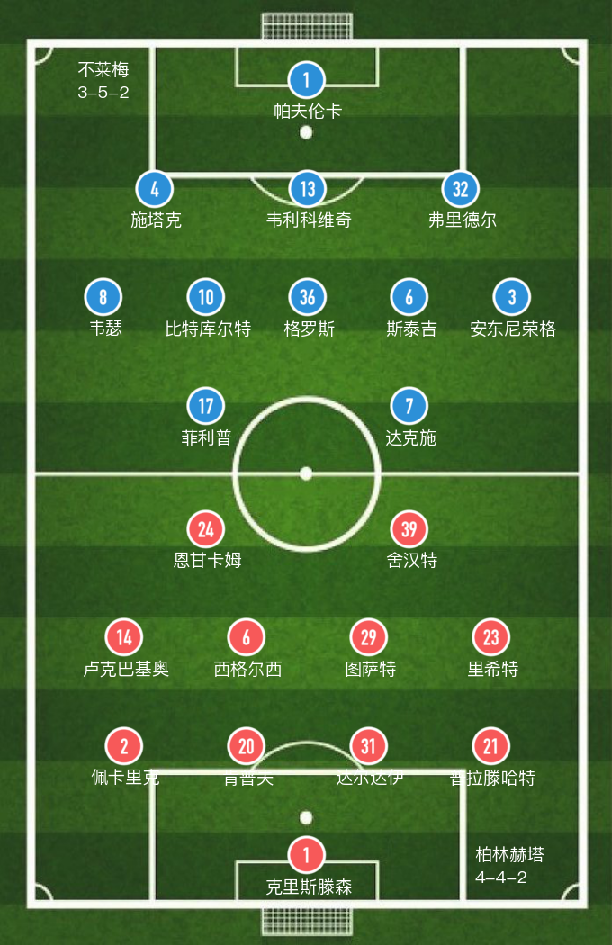 不莱梅(3-5-2): 1-帕夫伦卡,4-施塔克,13-韦利科维奇(80' 5-皮珀),32-弗里德尔,8-韦瑟,10-比特库尔特(66' 20-施密德),36-格罗斯(90' 28-格鲁耶夫),6-斯泰吉,3-安东尼荣格(80' 26-布坎南),17-菲利普(66' 21-丁奇),7-达克施