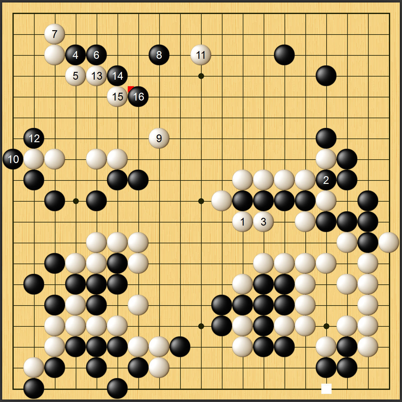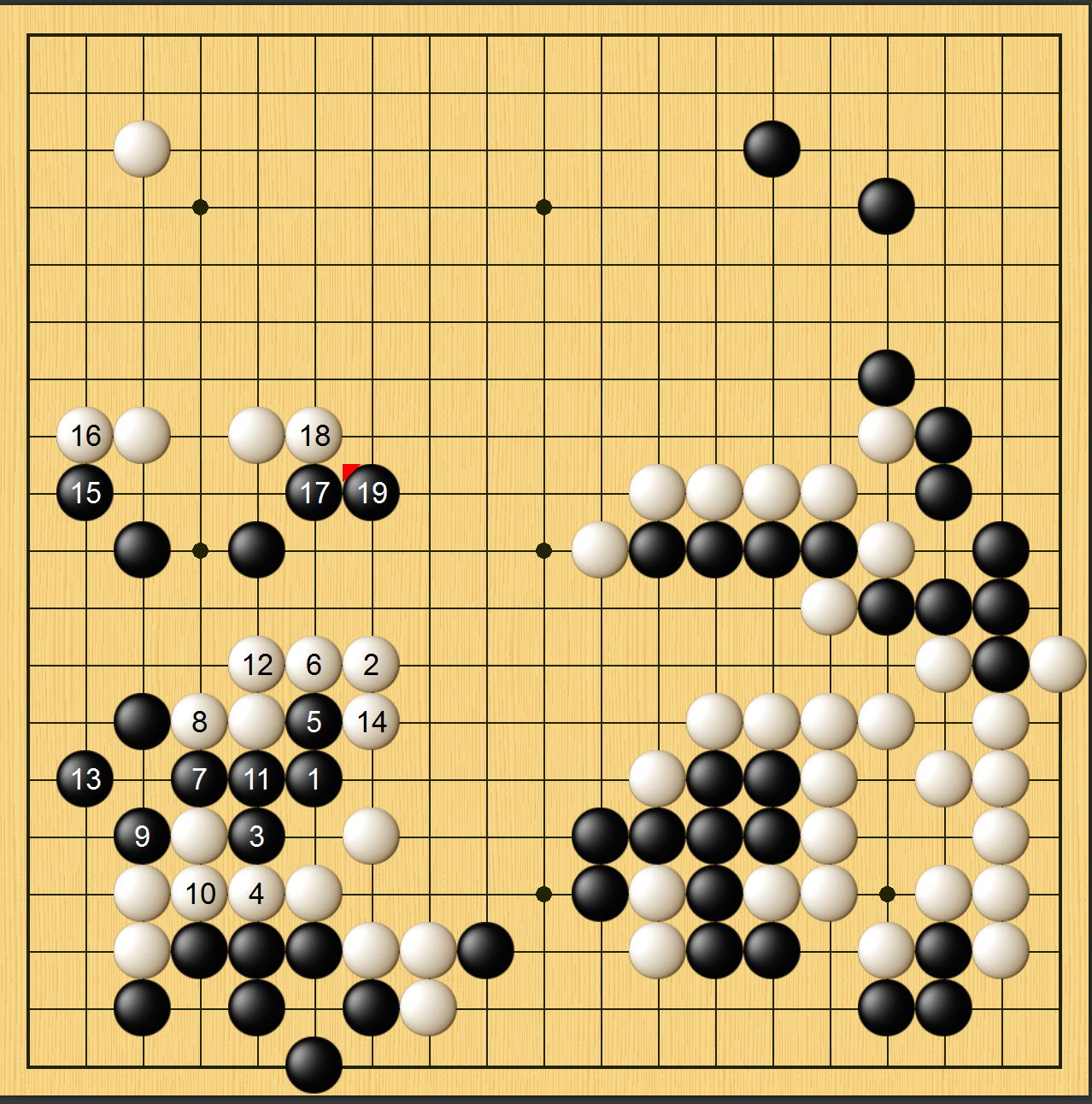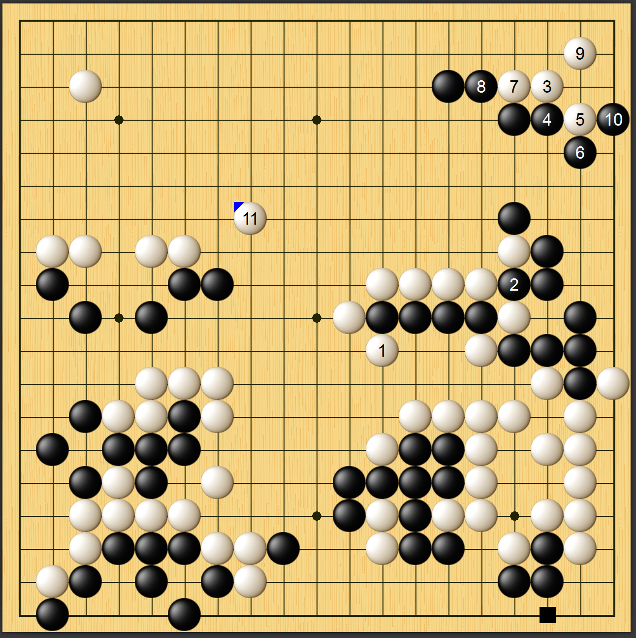 实战图一,李世石黑▲粘上后,白棋右下子效甚低,已然处于下风。此时白棋必须抢占上边大场,以此争胜负。