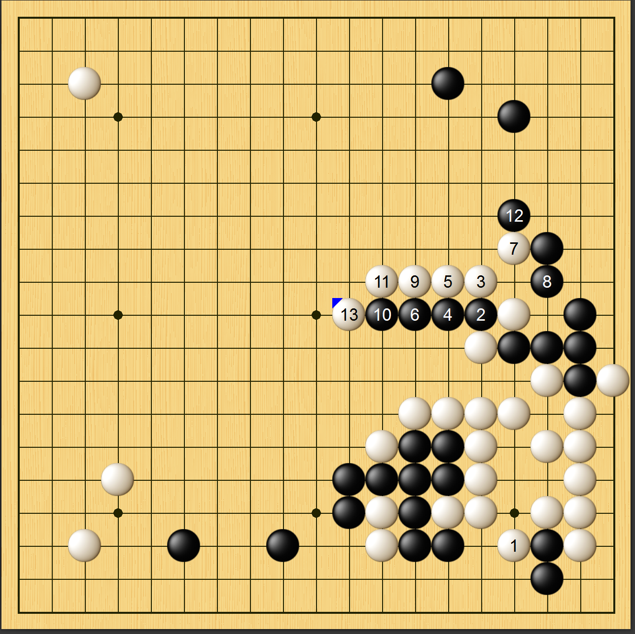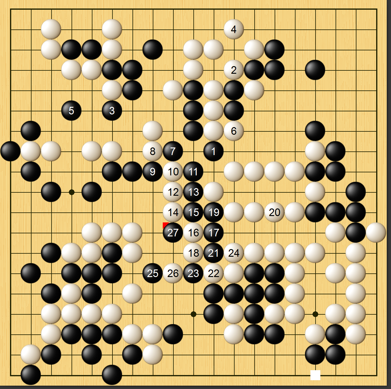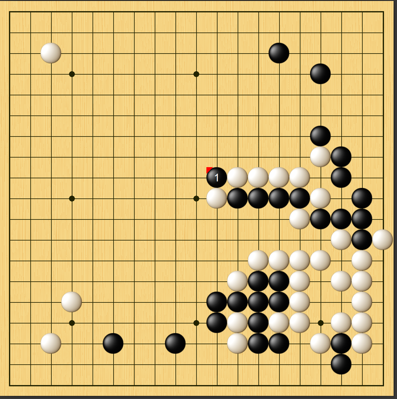实战图一,李世石黑▲粘上后,白棋右下子效甚低,已然处于下风。此时白棋必须抢占上边大场,以此争胜负。