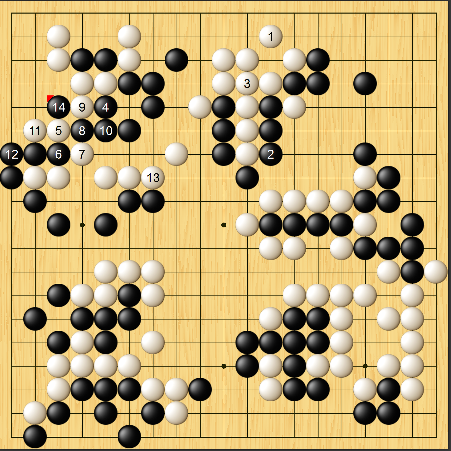 实战图三,李世石黑1选择在白子密集之处动手,不知道是什么意思。白2大局一飞,黑棋数子后手连回,极为无趣。至白18压,黑19长,左边盘这块黑棋仅仅是活棋而已,而左上白棋筑起大模样,明显得分。