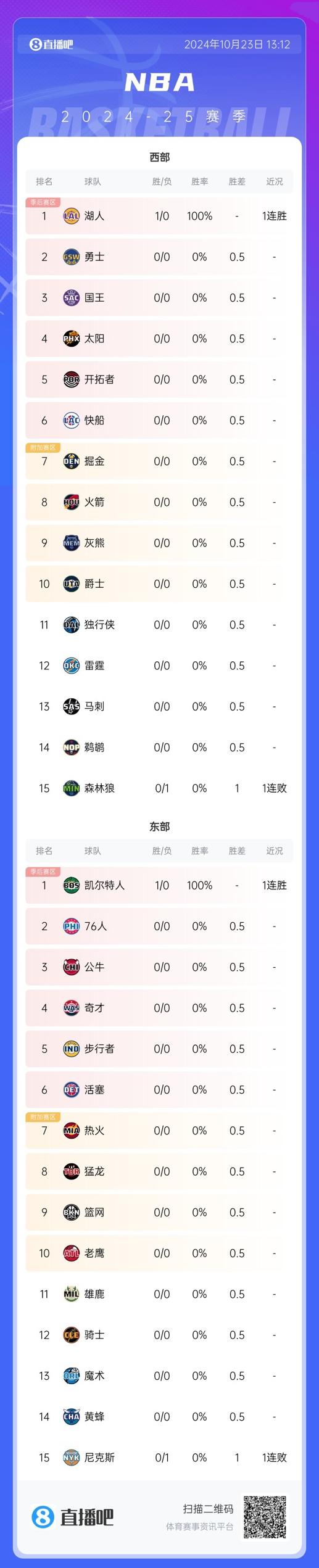 揭幕战过后,湖人1胜0负排名西部第一,凯尔特人1胜0负排名东部第一。