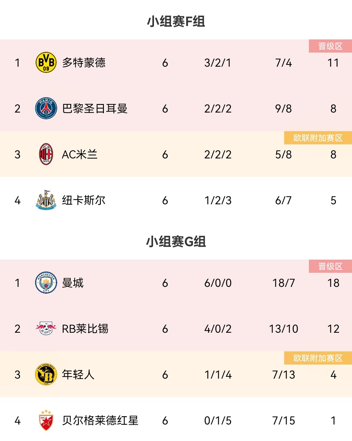 英超本赛季4支参赛队伍为:曼城、阿森纳、曼联、纽卡斯尔。曼城与阿森纳各自以所在小组的头名晋级16强,曼联与纽卡则均垫底出局。英超4队所在小组积分榜如下。