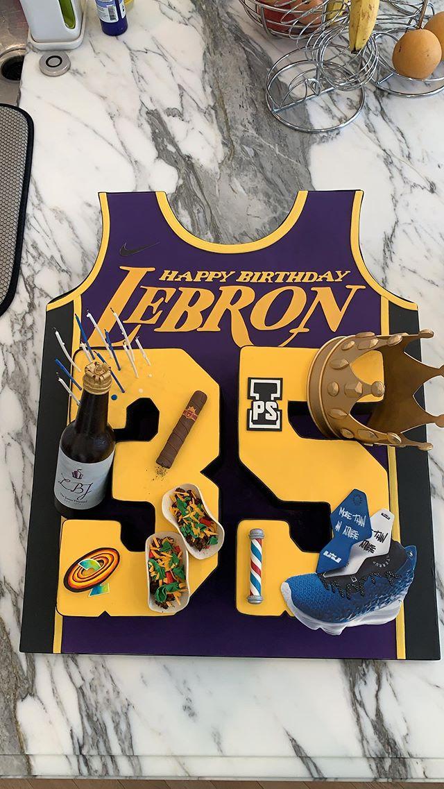 詹姆斯还在社媒上贴出了自己的生日蛋糕,球衣的底座上有35的字样,还有酒有雪茄,有王冠有球鞋,真是颇具老詹个人特色的蛋糕。