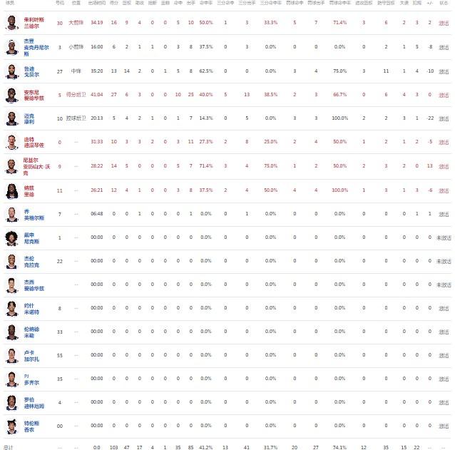 洛杉矶湖人安东尼-戴维斯36分16板4助3帽,八村垒18分5板1助,詹姆斯16分5板4助2帽,布朗尼2中0得0分1板;明尼苏达森林狼安东尼-爱德华兹27分6板3助,兰德尔16分9板4助,戈贝尔13分14板2助,沃克14分5板。