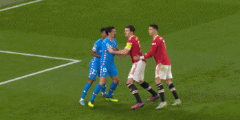 第66分钟,B费主罚右路任意球,马奎尔抢点时脑袋不慎顶到C罗,C罗下意识捂了一下嘴,随后奋力争顶但未能碰到皮球。