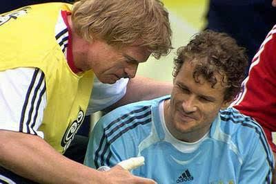 自从1990年世界杯决战一别后,这两个性格迥异的巨人终于又在世界杯的赛场上四目相望,十六年使得多少壮士一去不复返,斗转星移,当年意气风发的克林斯曼也生出了几丝白发,只能在场边指点江山,看着巴拉克们与里克尔梅们穿越在熙熙攘攘的人海中。