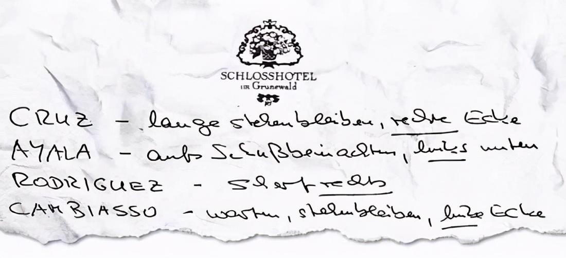 根据当时德国《图片报》记者的披露,当时小纸条上面写着阿根廷队主罚点球球员的名字,以及他们的发球习惯。