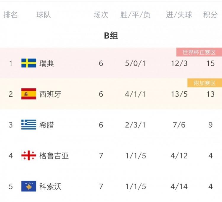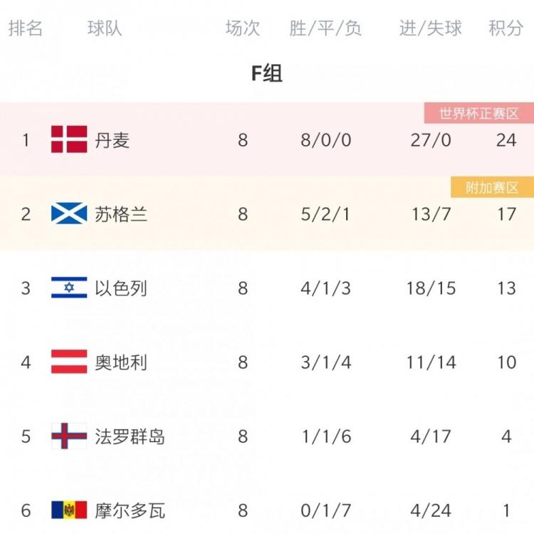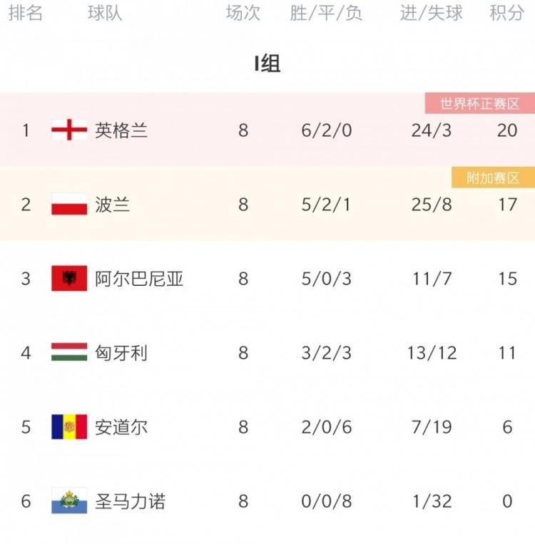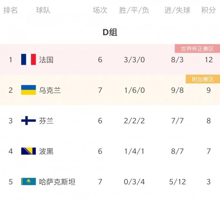 2022年世界杯欧洲区积分榜?1法国 8 5 3 0 18 3 15 182乌克兰 8 2 6 0 11 8 3 123芬兰 8 3 2 3 10 10 0 114波黑8 1 4 3 9 12 -3 75哈萨克斯坦80...