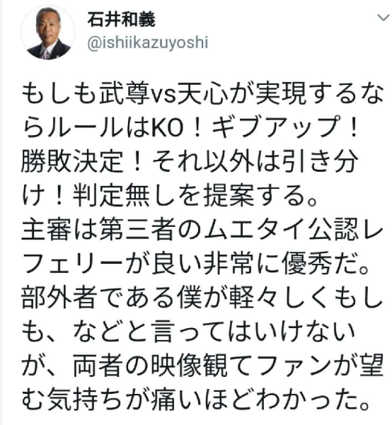 近日,前日本K-1世界格斗比赛创始人石井和义在社交平台表示“希望看到日本小级别最强的两个人武尊和那须川天心的大战“