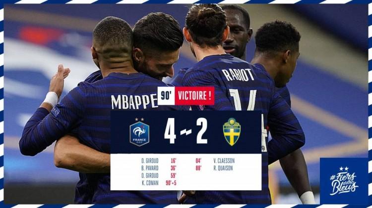 瑞典第88分钟扳回一城,本特松禁区左侧底线附近传中,奎森近距离破门,2-3。法国第94分钟锁定比分,瑞典前场任意球机会全部压上,迪涅拦截解围形成快速反击,科曼突破至40码处射入空门,4-2。