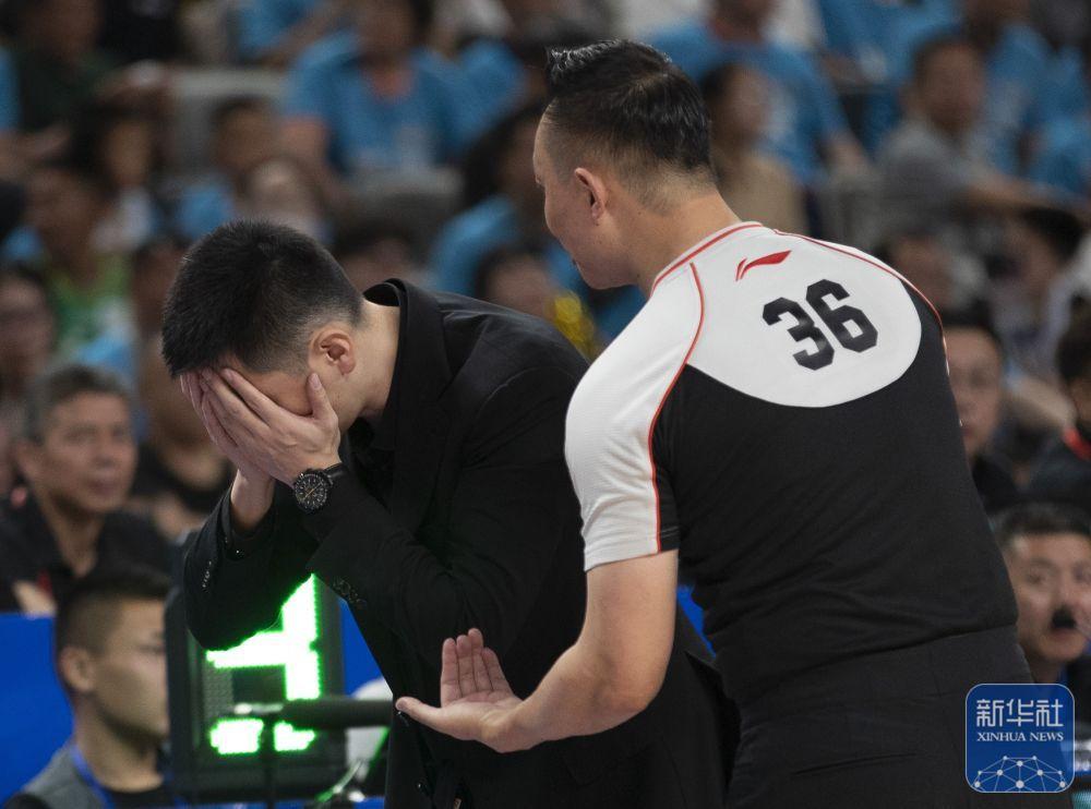 ↑辽宁本钢队主教练杨鸣(右)在比赛中和第一副裁判闫军交流。新华社记者 雒圆 摄