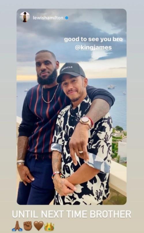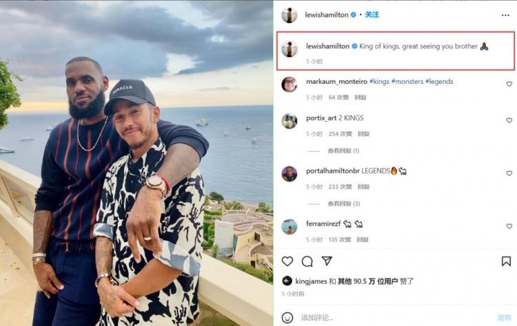 汉密尔顿也在自己的INS晒出与詹姆斯合照,并写道:“万王之王,很高兴见到你,兄弟??!@詹姆斯”