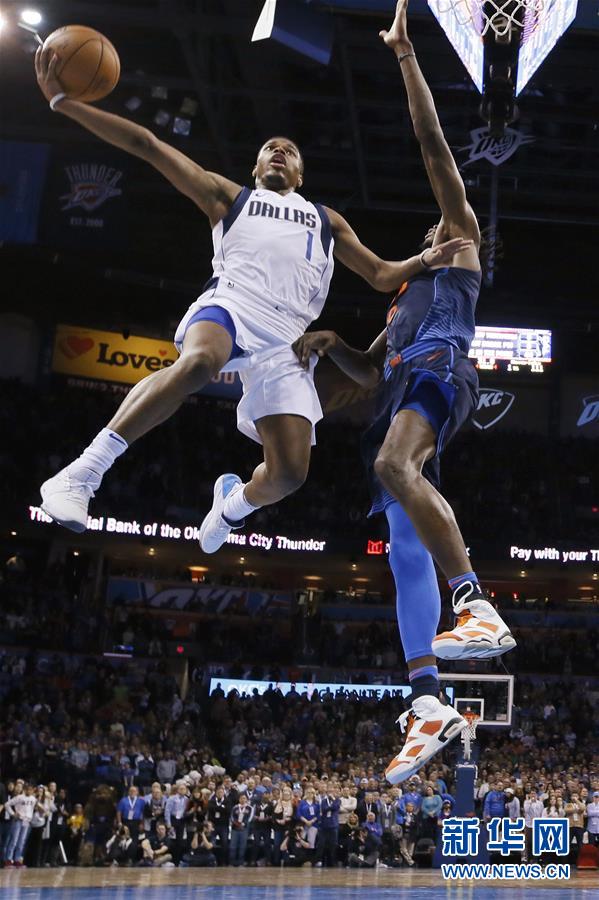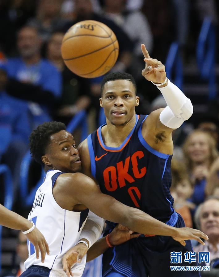 新华社照片,美联,2018年1月1日 (体育)(3)篮球——NBA常规赛:小牛胜雷霆 2017年12月31日,雷霆队球员威斯布鲁克(右)在比赛中传球。当日,在2017-2018赛季NBA常规赛中,达拉斯小牛队客场以116比113战胜俄克拉荷马雷霆队。 新华社/美联
