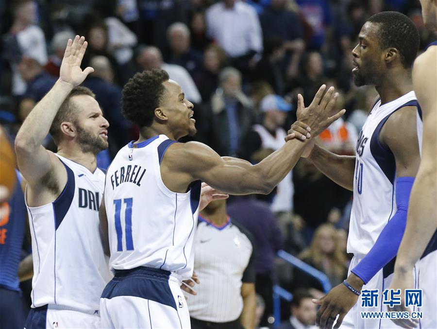 ↑2017年12月31日,小牛队球员哈里森·巴恩斯(右)与队友巴雷亚(左)、费雷尔庆祝胜利。当日,在2017-2018赛季NBA常规赛中,达拉斯小牛队客场以116比113战胜俄克拉荷马雷霆队。 新华社/美联