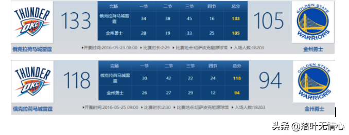 NBA季后赛系列赛中,有时候适当放弃一些比赛很正常,像而随后雷霆回到自己的主场比赛中,G3比赛133-105,G4比赛118-94顺利拿下勇士,让自己拿到了总决赛的赛点。