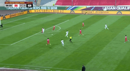 第65分钟,李在成前场带球被断,伊朗队快速反击,塔雷米高速推进,禁区内横传门前被韩国队后卫破坏。