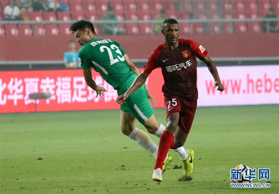 8月11日,河北华夏幸福队球员卡埃比(右)突破贵州恒丰队球员韩鹏飞的防守。新华社发(周洋 摄)