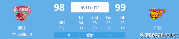 第四节 ,开局易建联送给浙江队一记篮板大帽。本局有点看不懂,吴前那个可以给“3+1”,这个裁判有点偏向了哈。不过浙江队极其顽强,持续追分,在剩余8分钟时追至86-90。剩余6分25秒,浙江88-92广东,杜锋赶紧叫暂停。浙江本节让广东多回合不得分,但是浙江队没三分出手机会,广东多次出手三分,周鹏的一记三分给广东吃了个定心丸。最后几秒,浙江追至96-97,但是广东队莱多关键枪抢断,浙江队失去最后一攻机会,只能在最后10s内犯规。然后易建联两罚全中,96-99,最后5s,吴前出手三分,吹了易建联三分犯规,0.8s,但是吴前第一罚不中,比赛结束。