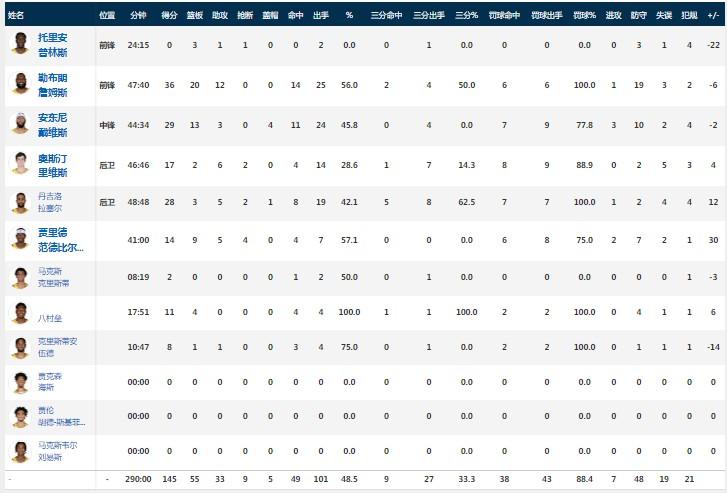 洛杉矶湖人詹姆斯36分20板12助,戴维斯29分13板3助4帽,拉塞尔28分3板5助2断1帽。