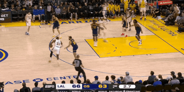 第二节,库里戏耍晃飞八村塁三分命中,勇士42-41湖人