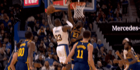 第一节,詹姆斯反击原地暴起单臂劈扣,湖人19-17勇士