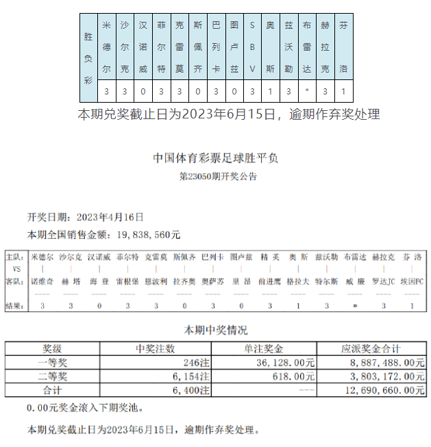 北京时间4月16日,胜负彩第23050期开奖结束揭晓。14场1等246注36128元,14场2等开出6154注618元,任九开出33041注403元。本期胜负彩销量为19,838,560元,任九投注总额为20,808,316元。