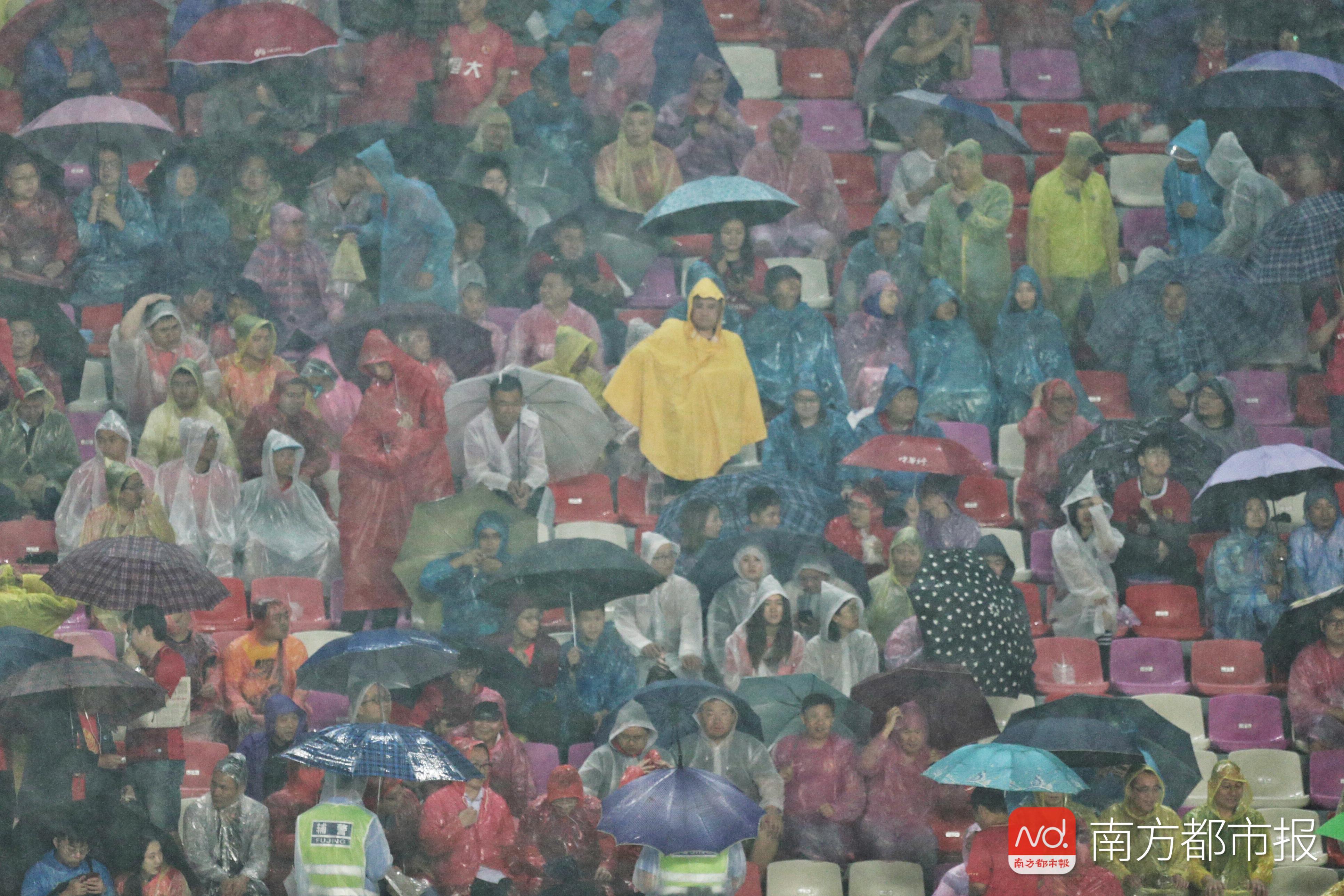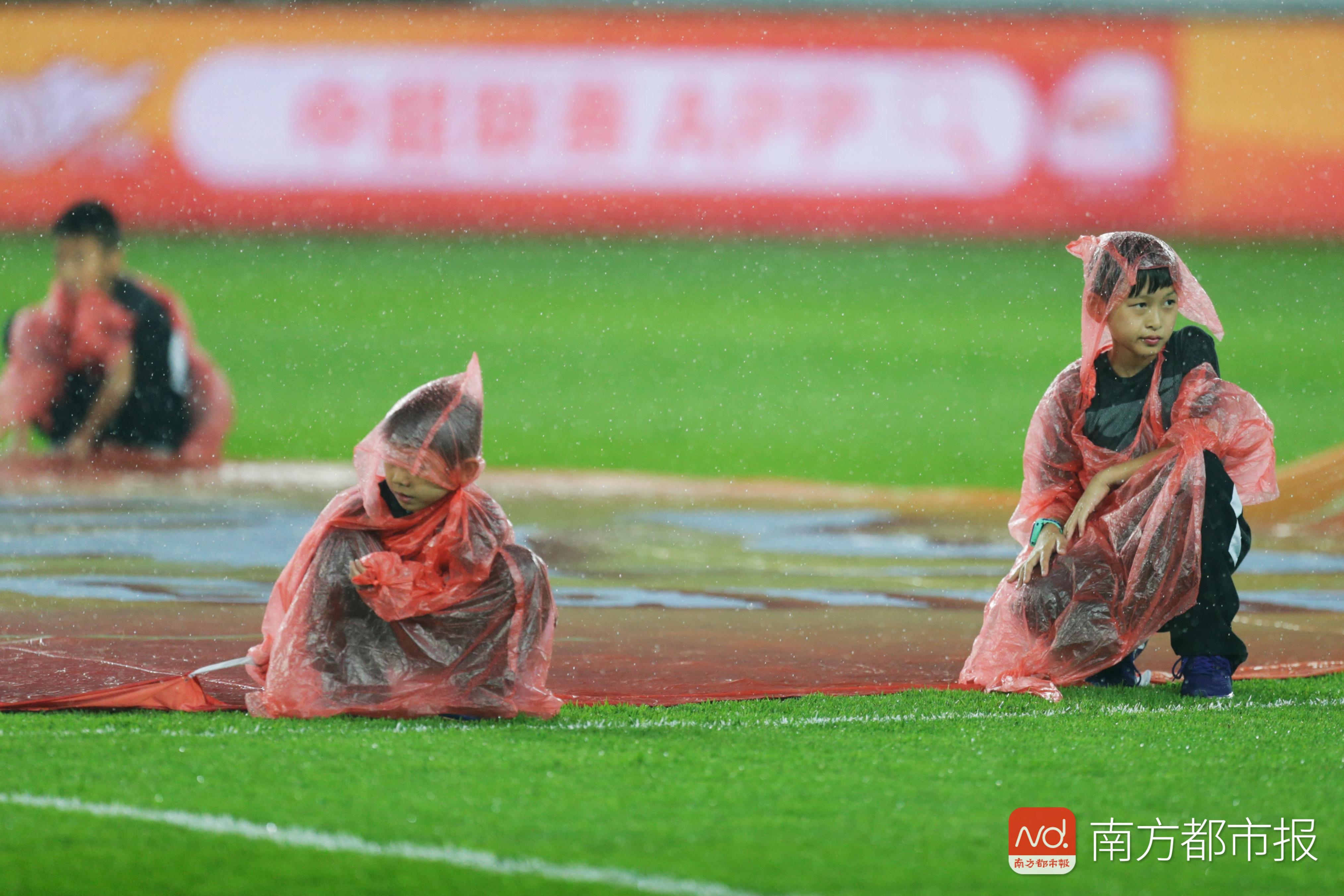 降雨导致草皮积水,双方球员场上攻防“打水仗”。图by 黎湛钧
